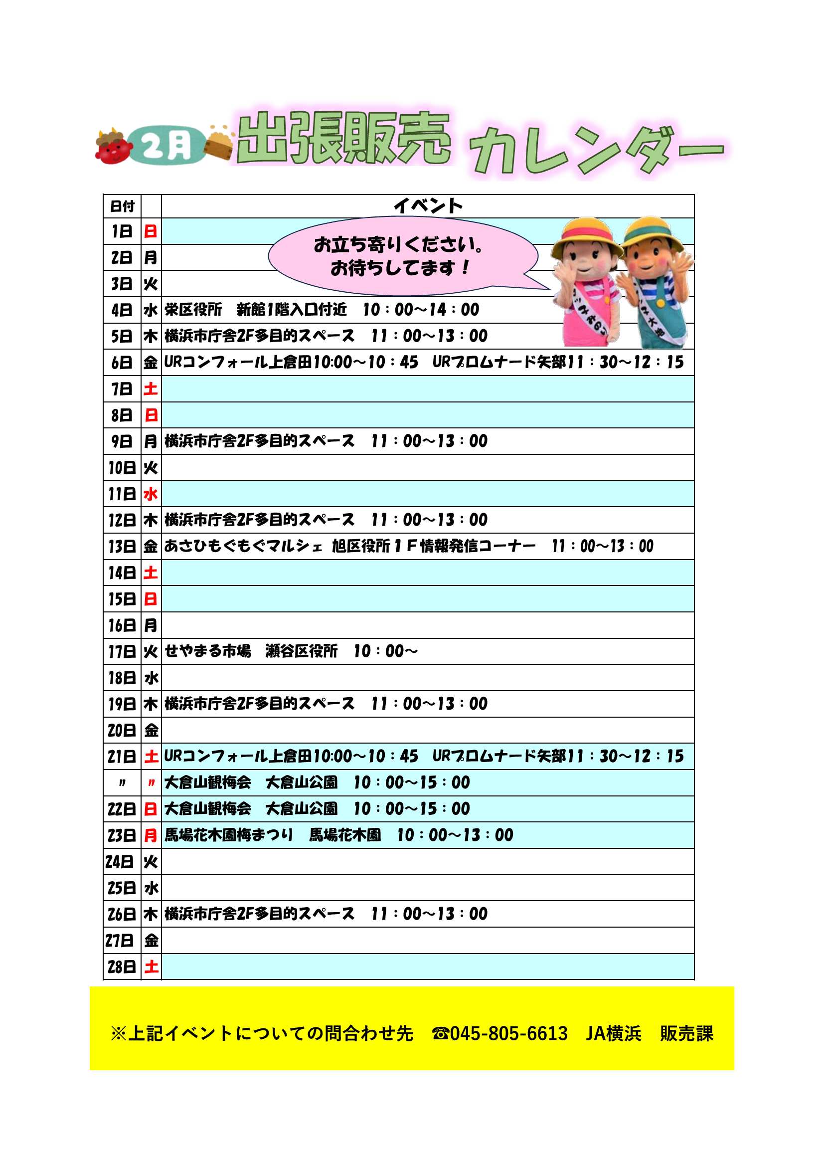 2月につきましては、以下のスケジュールにて実施しますので、お近くにお越しの際はぜひお立ち寄りください!