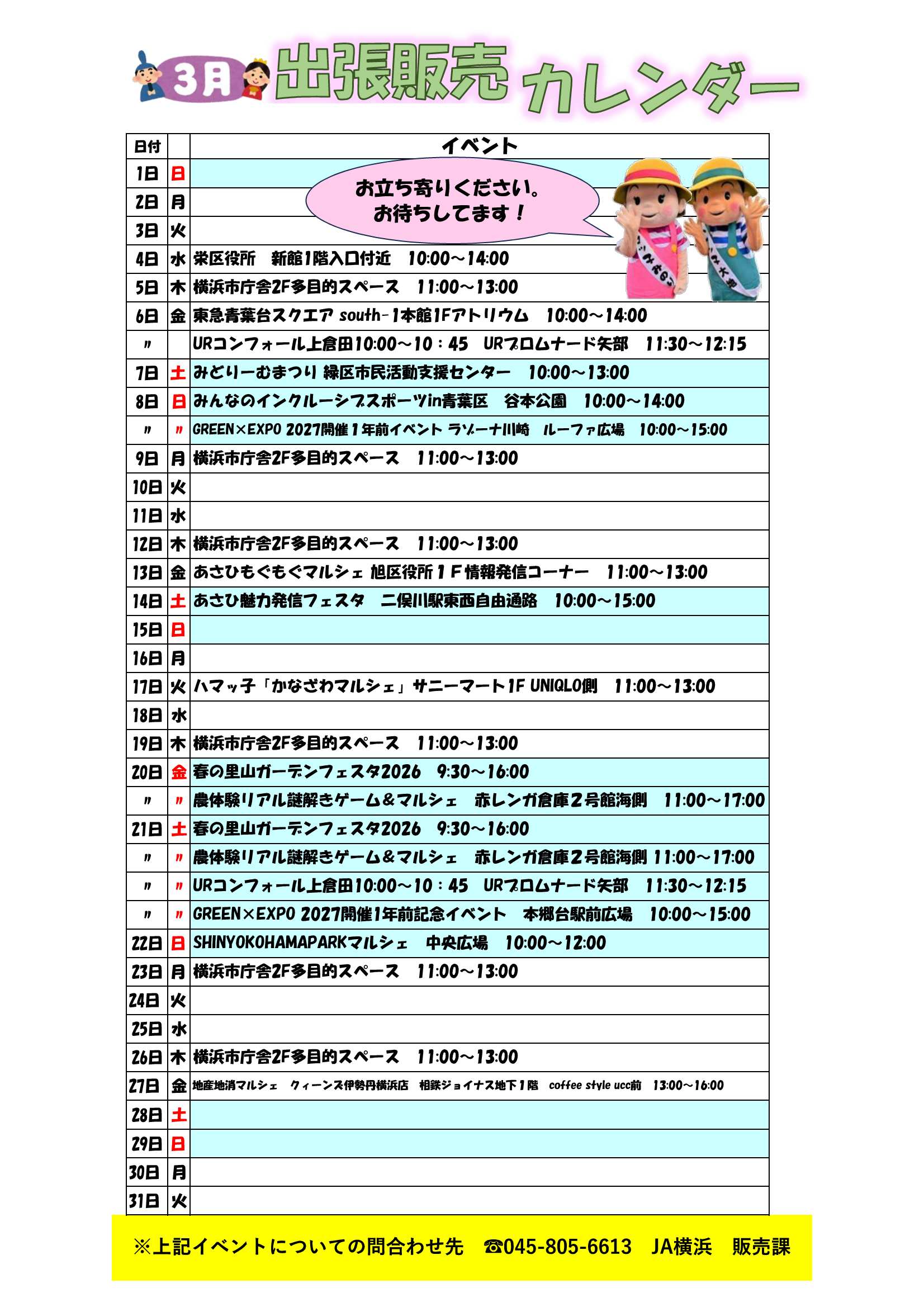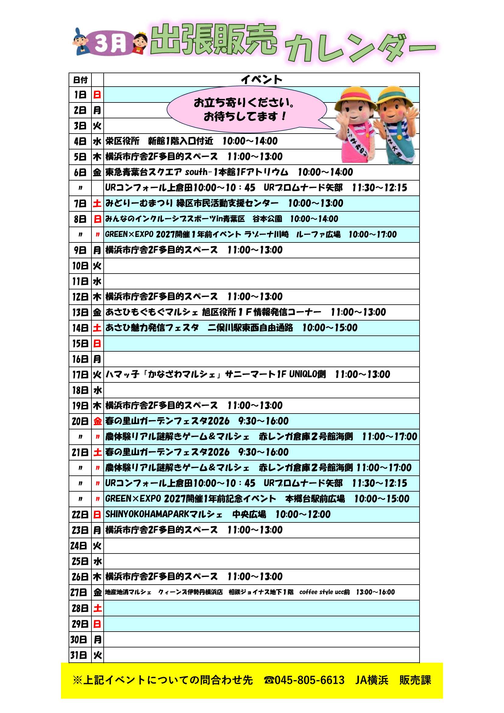 2026/03/02 3月出張販売カレンダー 当JAでは、地産地消の推進ならびに横浜産農畜産物の魅力のさらなるPRに向け、市内に13店舗ある「ハマッ子」直売所のほか、出張販売も行っています。 3月につきましては、以下のスケジュールにて実施しますので、お近くにお越しの際はぜひお立ち寄りください!