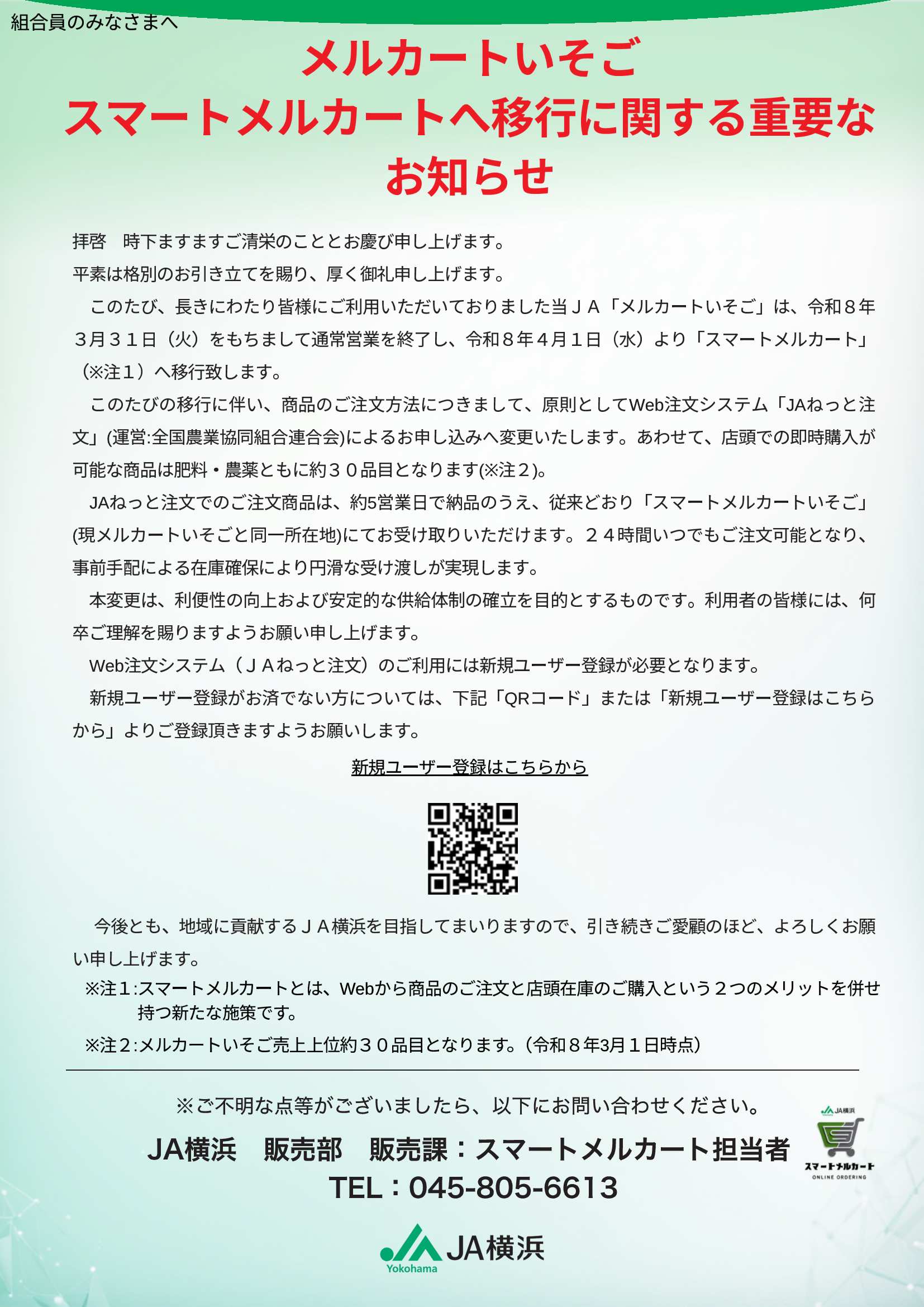 このたび、長きにわたり皆様にご利用いただいておりました当JA「メルカートいそご」は、令和8年3月31日(火)をもちまして通常営業を終了し、令和8年4月1日(水)より「スマートメルカート」へ移行致します。詳しくは以下の添付チラシをご覧ください。