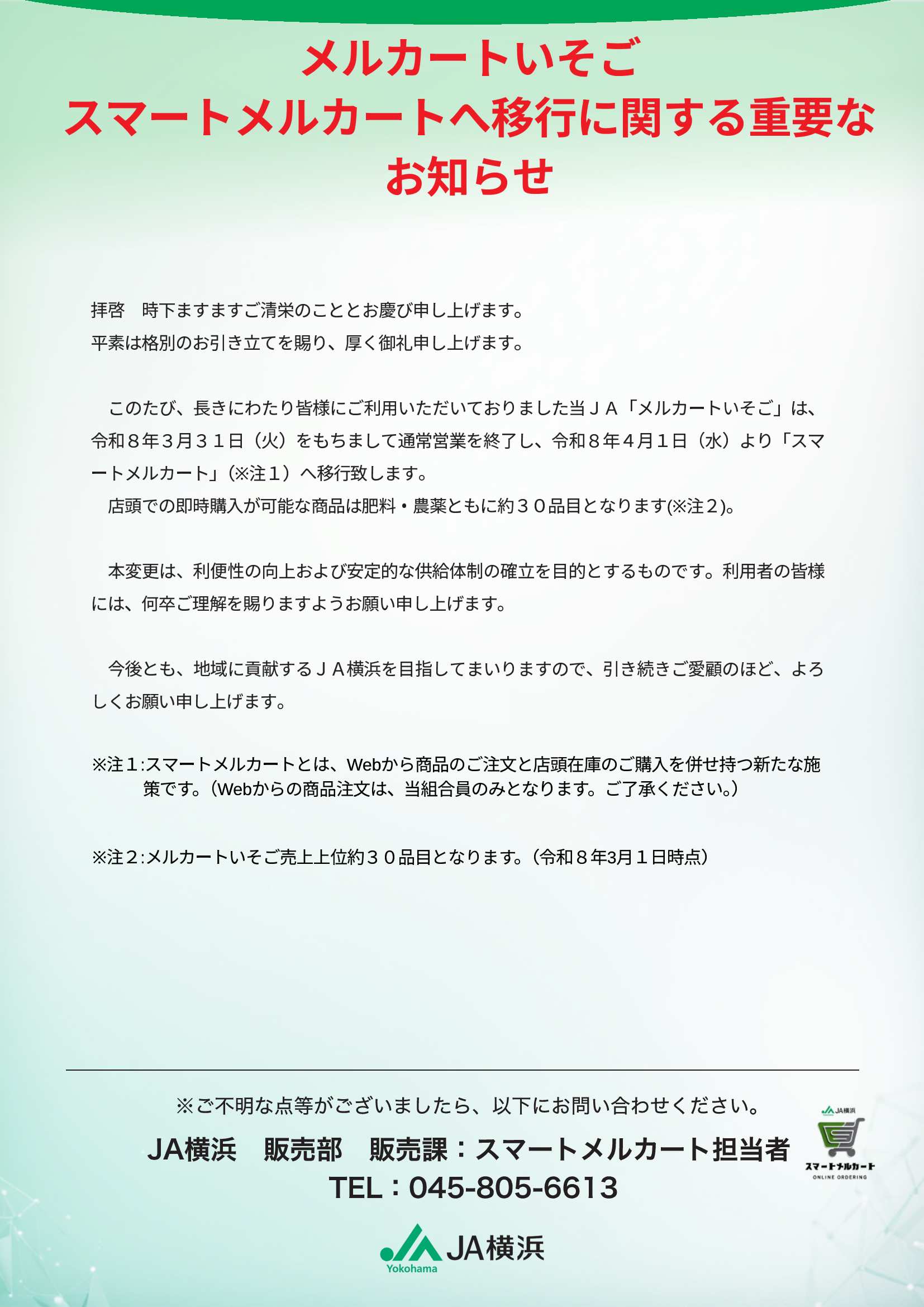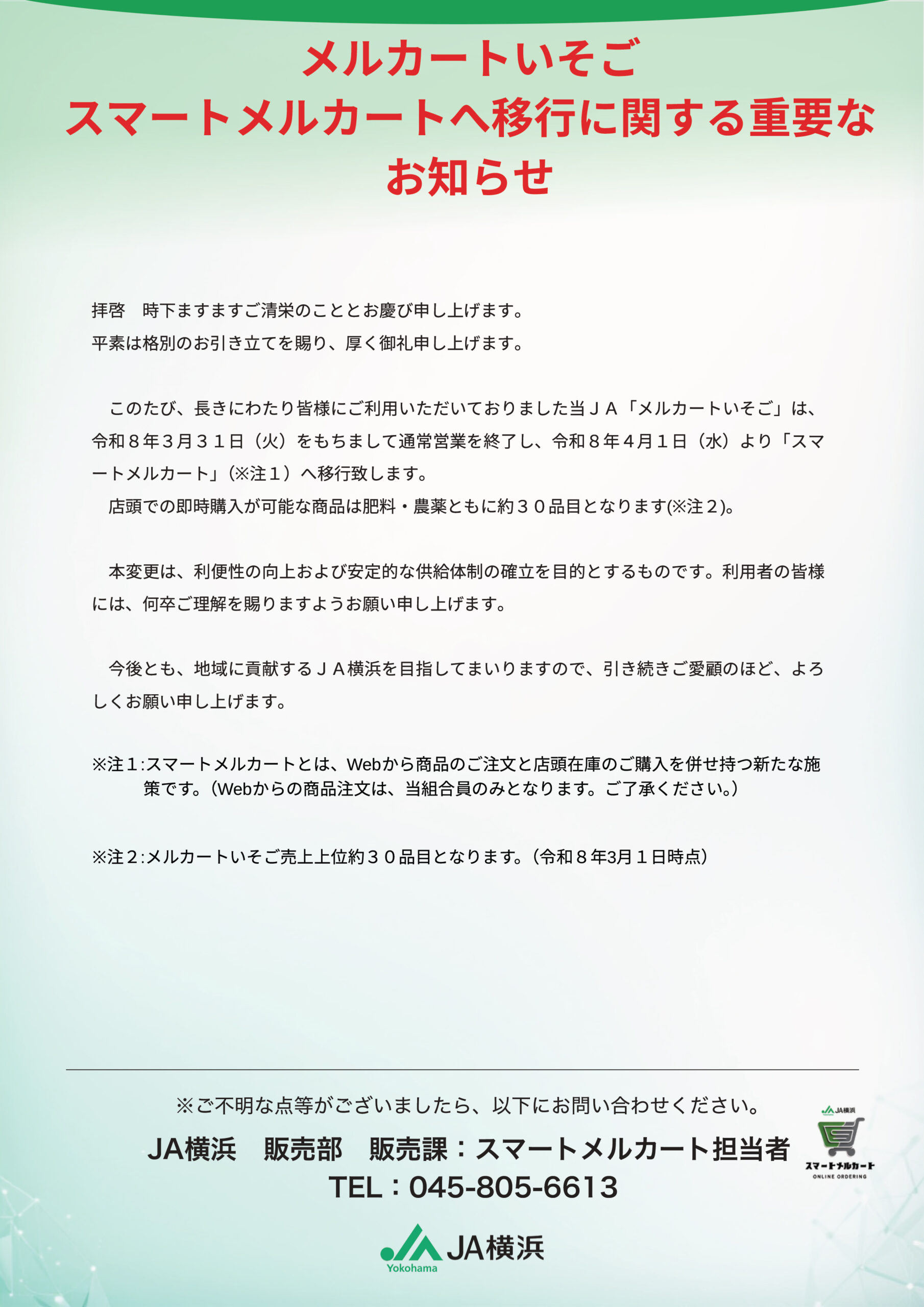 2026/03/02 重要 メルカートいそご スマートメルカートへ移行に関する重要なお知らせ このたび、長きにわたり皆様にご利用いただいておりました当JA「メルカートいそご」は、令和8年3月31日(火)をもちまして通常営業を終了し、令和8年4月1日(水)より「スマートメルカート」へ移行致します。詳しくは以下の添付チラシをご覧ください。 今後とも、地域に貢献するJA横浜を目指してまいりますので、引き続きご愛顧のほど、よろしくお願い申し上げます。