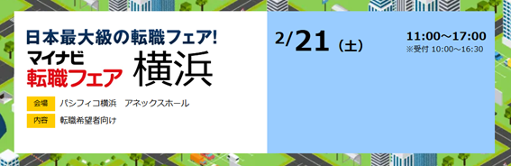 2026/02/19 重要 【社会人経験者】「マイナビ転職フェア横浜」に参加します! (主催:株式会社 マイナビ) ■日程 2026年2月21日(土) 11:00~17:00 ■会場 パシフィコ横浜 アネックスホール ■イベント詳細
